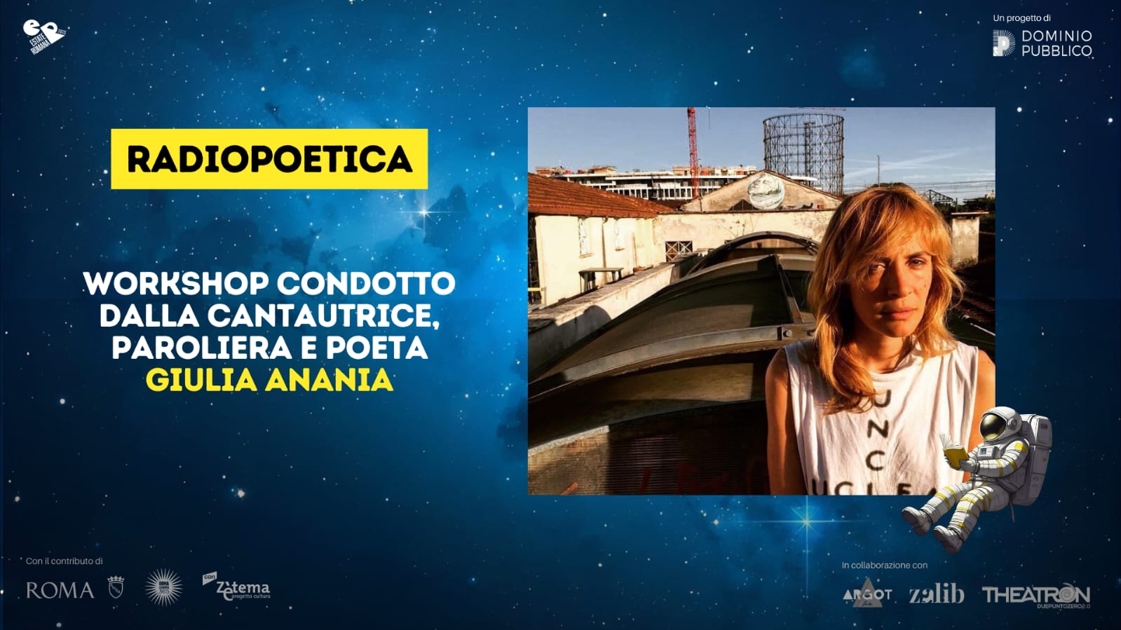 Il workshop Radiopoetica condotto da Giulia Anania, musicista, cantautrice e poetessa, porterà i partecipanti a realizzare un dj set e podcast di sola poesia che verrà trasmesso ovunque ci sia bisogno di salvare il mondo. La poesia, frutto di una serie di esercizi di scrittura, di lettura e di sensibilizzazione, sarà un'occasione per scoprire se stessi e gli altri. I testi e le voci dei partecipanti saranno trasmessi in varie occasioni pubbliche e festival.