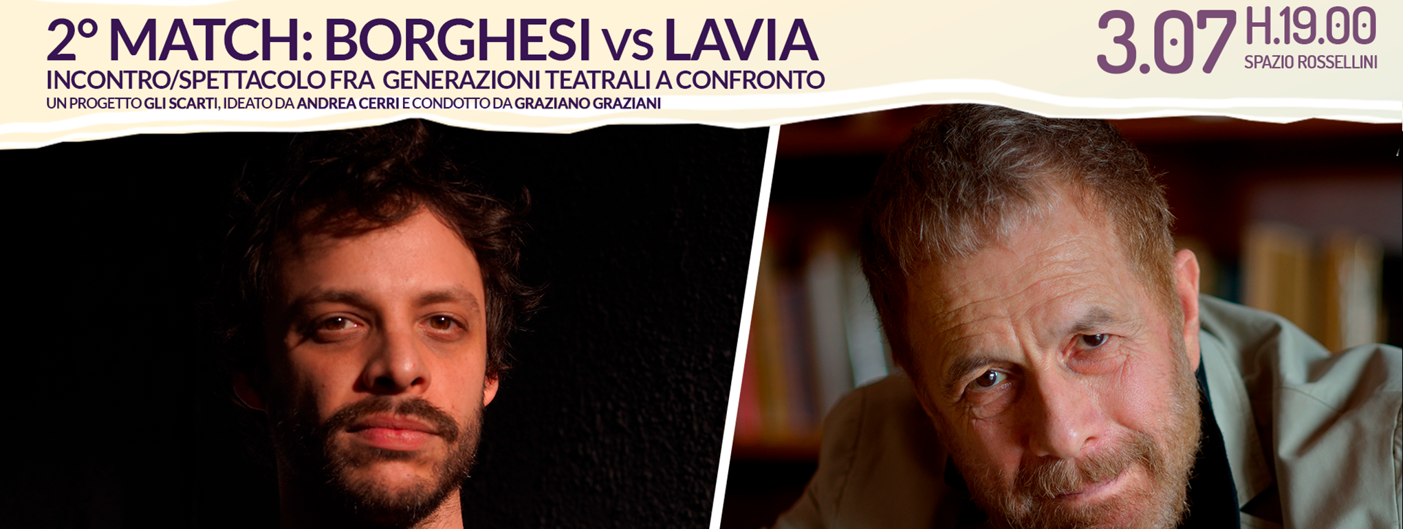 Artisti e compagnie young si scontreranno con un grande e noto artista del panorama teatrale: nel secondo incontro Nicola Borghesi ー regista e direttore della compagnia Kepler 452 ー si scontrerà con il maestro Gabriele Lavia. Conduce i due Match lo scrittore Graziano Graziani.