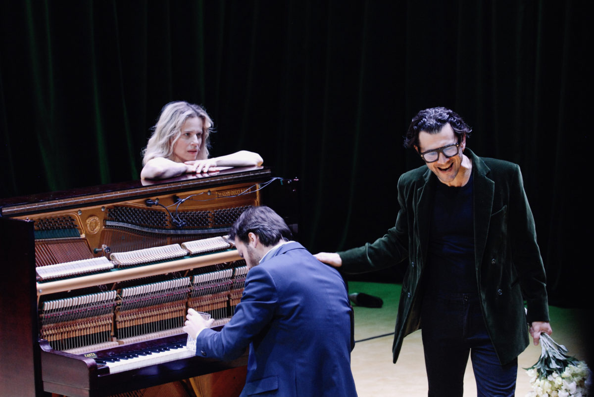 I quattro personaggi si muovono all’interno di uno spazio altamente surreale occupato da pochi mobili: una poltrona, una lampada di design, qualche gatto di porcellana, un pianoforte e uno stereo. Le scelte più singolari sono sicuramente un armadio che apre sul nulla e i tendaggi di velluto verde che circondano la scena, inscatolandola in una dimensione che a un certo punto dello spettacolo irrompe totalmente nell’onirico.